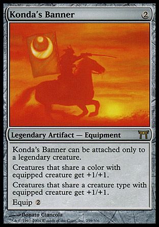 12/1/2004: A creature can't get more than +2/+2 from Konda's Banner. Sharing more than one color or more than one creature type with the equipped creature does nothing.
