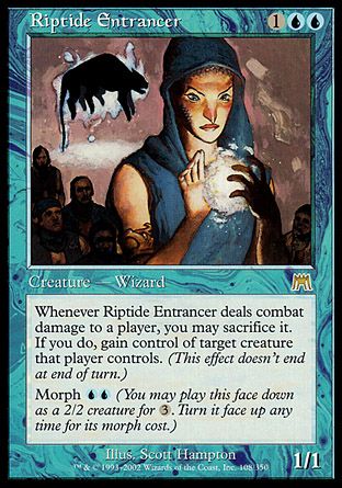 Whenever Riptide Entrancer deals combat damage to a player, you may sacrifice it. If you do, gain control of target creature that player controls. (This effect lasts indefinitely.)