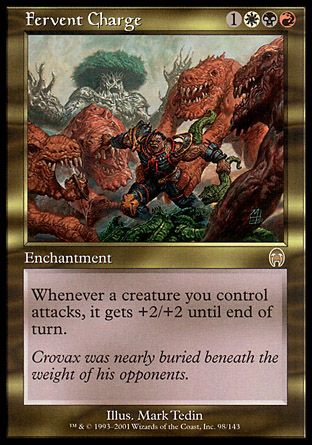 Whenever a creature you control attacks, it gets +2/+2 until end of turn.