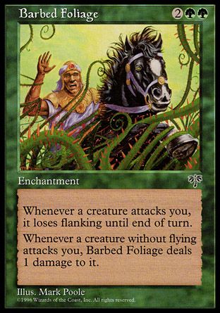 Whenever a creature without flying attacks you, Barbed Foliage deals 1 damage to it.
