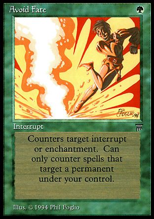 1/22/2011: Avoid Fate must target an instant spell or an Aura spell as it's cast, and it must be targeting an instant or an Aura spell at the time it resolves. It will still resolve if it starts out targeting a spell of one type but the target changes to a spell of the other type (thanks to Shunt, for instance) before it resolves.
