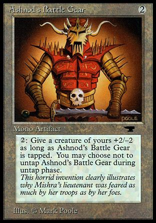 {2}, {T}: Target creature you control gets +2/-2 for as long as Ashnod's Battle Gear remains tapped.