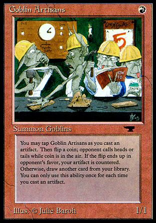 {T}: Flip a coin. If you win the flip, draw a card. If you lose the flip, counter target artifact spell you control that isn't the target of an ability from another creature named Goblin Artisans.