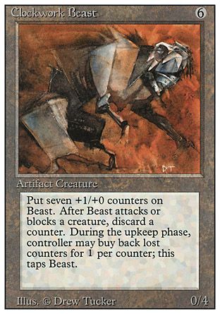9/16/2007: This is a change from the most recent wording. Now, if some other spell or ability causes +1/+0 counters to be put on Clockwork Beast, it can wind up with more than seven such counters on it.