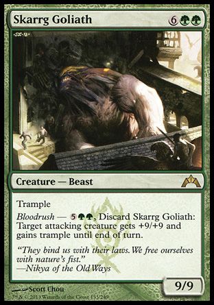 Bloodrush — {5}{G}{G}, Discard Skarrg Goliath: Target attacking creature gets +9/+9 and gains trample until end of turn.