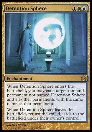 When Detention Sphere enters the battlefield, you may exile target nonland permanent not named Detention Sphere and all other permanents with the same name as that permanent.