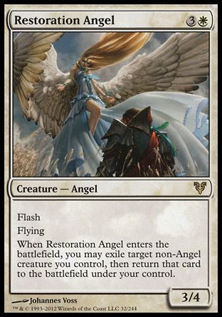 When Restoration Angel enters the battlefield, you may exile target non-Angel creature you control, then return that card to the battlefield under your control.
