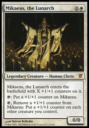 Mikaeus, the Lunarch enters the battlefield with X +1/+1 counters on it.