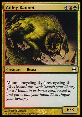Mountaincycling {2}, forestcycling {2} ({2}, Discard this card: Search your library for a Mountain or Forest card, reveal it, and put it into your hand. Then shuffle your library.)