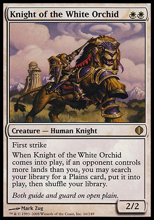 When Knight of the White Orchid enters the battlefield, if an opponent controls more lands than you, you may search your library for a Plains card, put it onto the battlefield, then shuffle your library.
