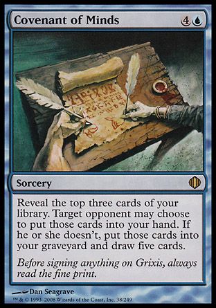 Reveal the top three cards of your library. Target opponent may choose to put those cards into your hand. If he or she doesn't, put those cards into your graveyard and draw five cards.