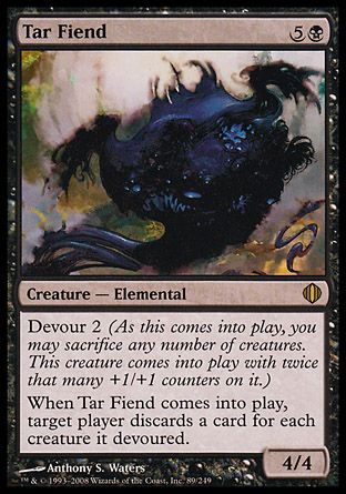 When Tar Fiend enters the battlefield, target player discards a card for each creature it devoured.