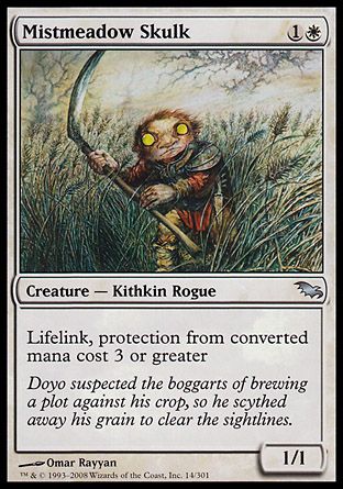 5/1/2008: The protection ability means the following: - Mistmeadow Skulk can't be blocked by creatures with converted mana cost 3 or greater. - Mistmeadow Skulk can't be enchanted by Auras with converted mana cost 3 or greater. It also can't be equipped by Equipment with converted mana cost 3 or greater. - Mistmeadow Skulk can't be targeted by spells with converted mana cost 3 or greater. It also can't be targeted by abilities from sources with converted mana cost 3 or greater. - All damage that would be dealt to Mistmeadow Skulk by sources with converted mana cost 3 or greater is prevented.