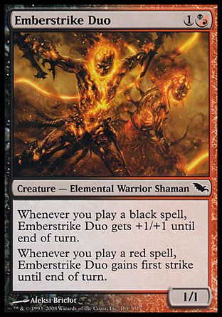 Whenever you cast a black spell, Emberstrike Duo gets +1/+1 until end of turn.