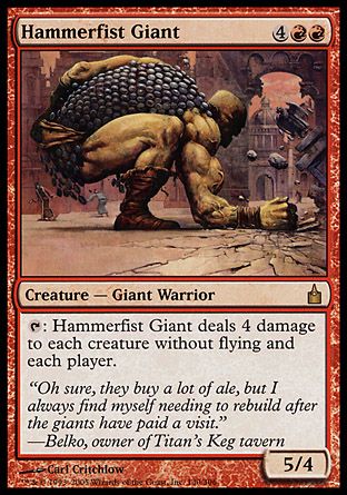 {T}: Hammerfist Giant deals 4 damage to each creature without flying and each player.